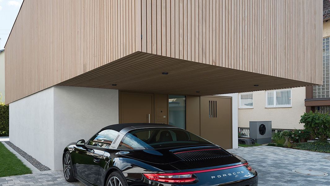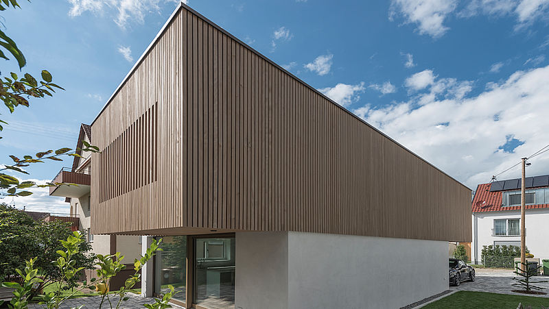 Der Neubau ist ein gutes Beispiel für maßvolles Bauen im Ballungsraum der Stadt Stuttgart. Ein nicht genutztes Gartengrundstück lässt ein kleines aber feines Einfamilienhaus zu, das zu einer verträglichen Nachverdichtung unter Wahrung der Privatsphäre der Nachbarn beiträgt. Es wird hochwertiger Wohnraum geschaffen an einer Stelle von bisher nicht genutzten Hausgärten. Der Neubau ist ein Maßanzug für ein Ehepaar. Bedarfsgerechtes Bauen wird zum Entwurfsprinzip. Zwei gestapelte und versetzt zueinander angeordnete Kuben beinhalten im EG Kochen, Essen, Wohnen, die Gebäudetechnik und ein Tages-WC. Auf ein Untergeschoss wurde verzichtet. Im Obergeschoss gibt es über eine Galerie erschlossen ein Schlafzimmer mit Ankleide und ein großzügiges Bad. Durch die versetzte Anordnung der Kuben ergibt sich im Obergeschoss eine Dachterrasse und im Erdgeschoss ein überdachter Vorplatz.