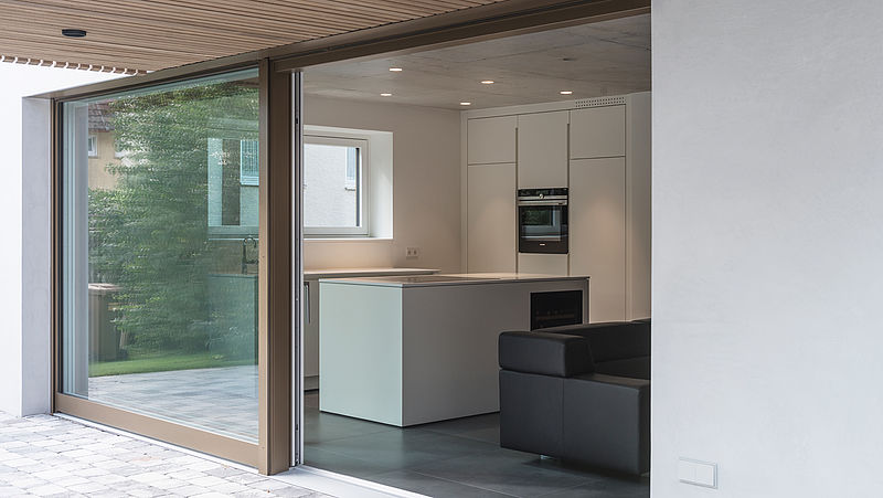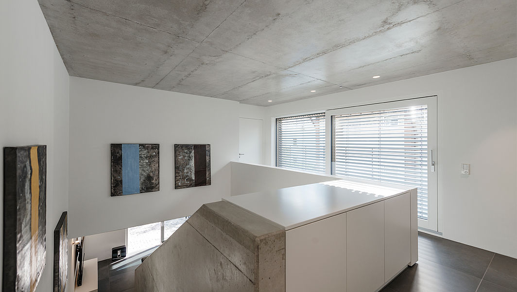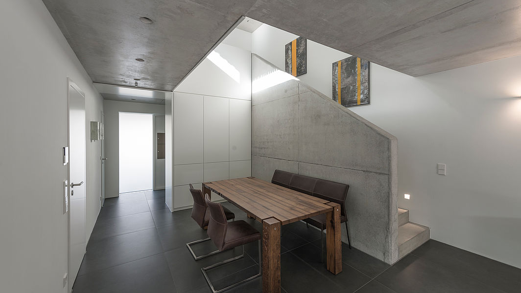 Das Gebäude wird als Stahlbetonbau konstruiert. Die Innentreppe, die Decken und eine Wandscheibe bleiben in Beton sichtbar. Alle anderen Wände werden glatt verputzt und weiß gestrichen. Die Fußböden werden mit großen Feinsteinzeugfliesen und Eicheparkett belegt. Die großen Holz-Alufenster erweitern die Grundrisse ins Freie. Alle festeingebauten Möbel sind individuell geplant und auf Maß vom Schreiner gefertigt und eingepasst. Wände werden zu Schränken. Möbel werden zu raumbildenden Elementen. Die Materialien gehen fließend ineinander über. Das Gebäude ist im Erdgeschoss mit einer geglätteten Kalkputzoberfläche gestaltet. Das Obergeschoss wurde komplett mit vorpatinierter Weißtanne verkleidet. Die stehenden Leisten haben den Querschnitt 4/5cm und einen Abstand von 1,5cm. Vor dem Fenster des Schlafzimmers läuft jede zweite Leiste durch, um die Form ohne sichtbares Fenster zu wahren.